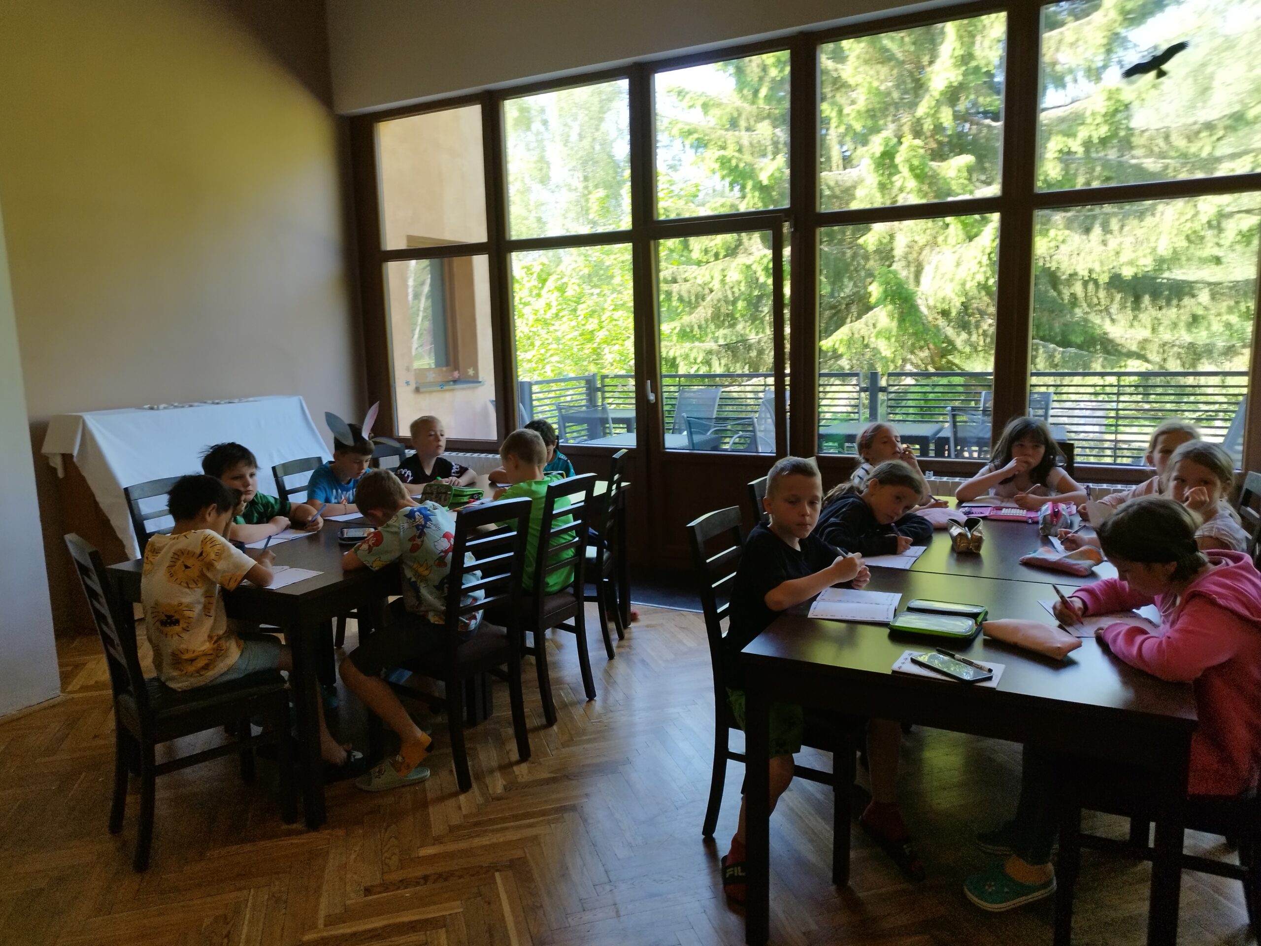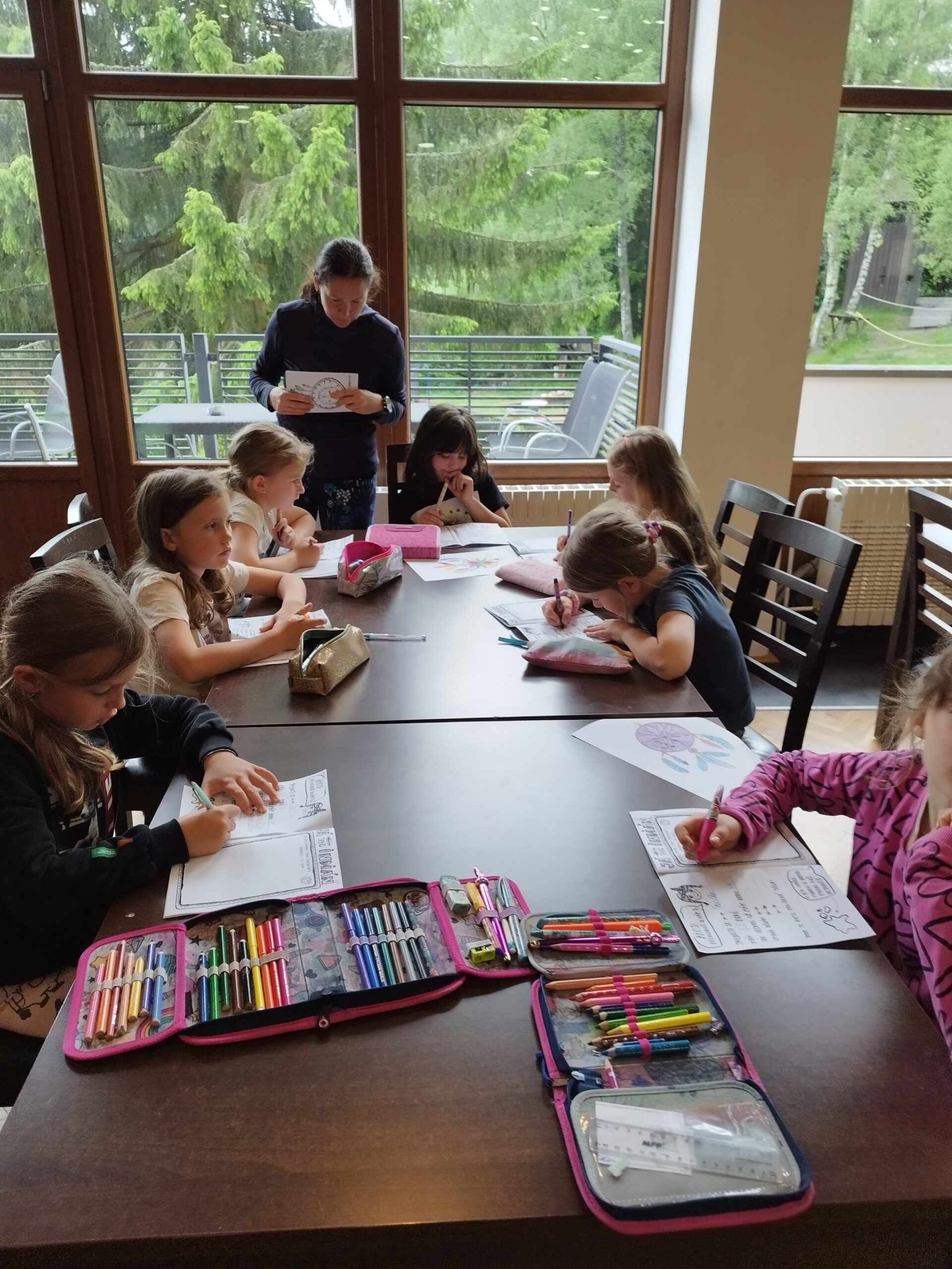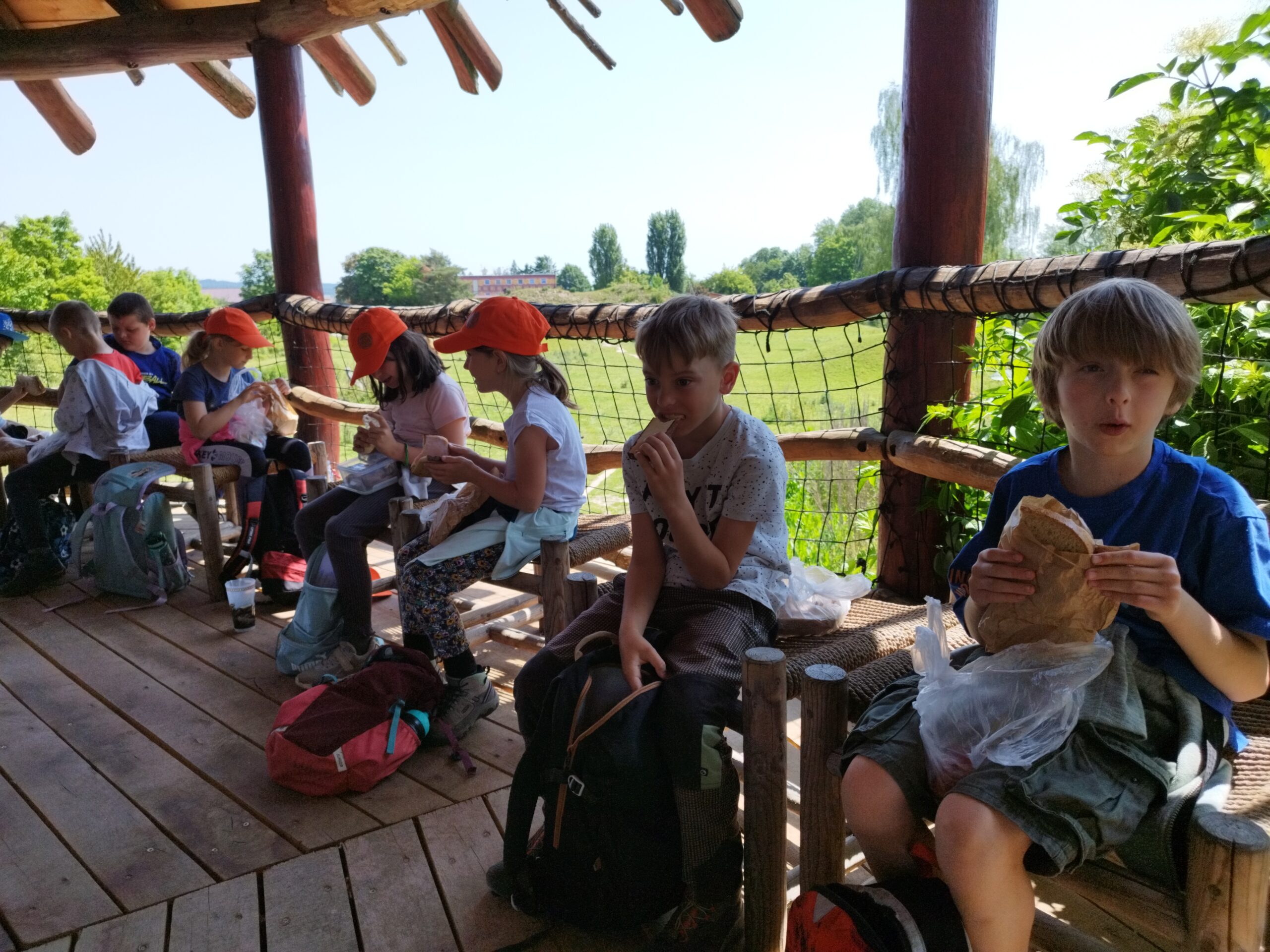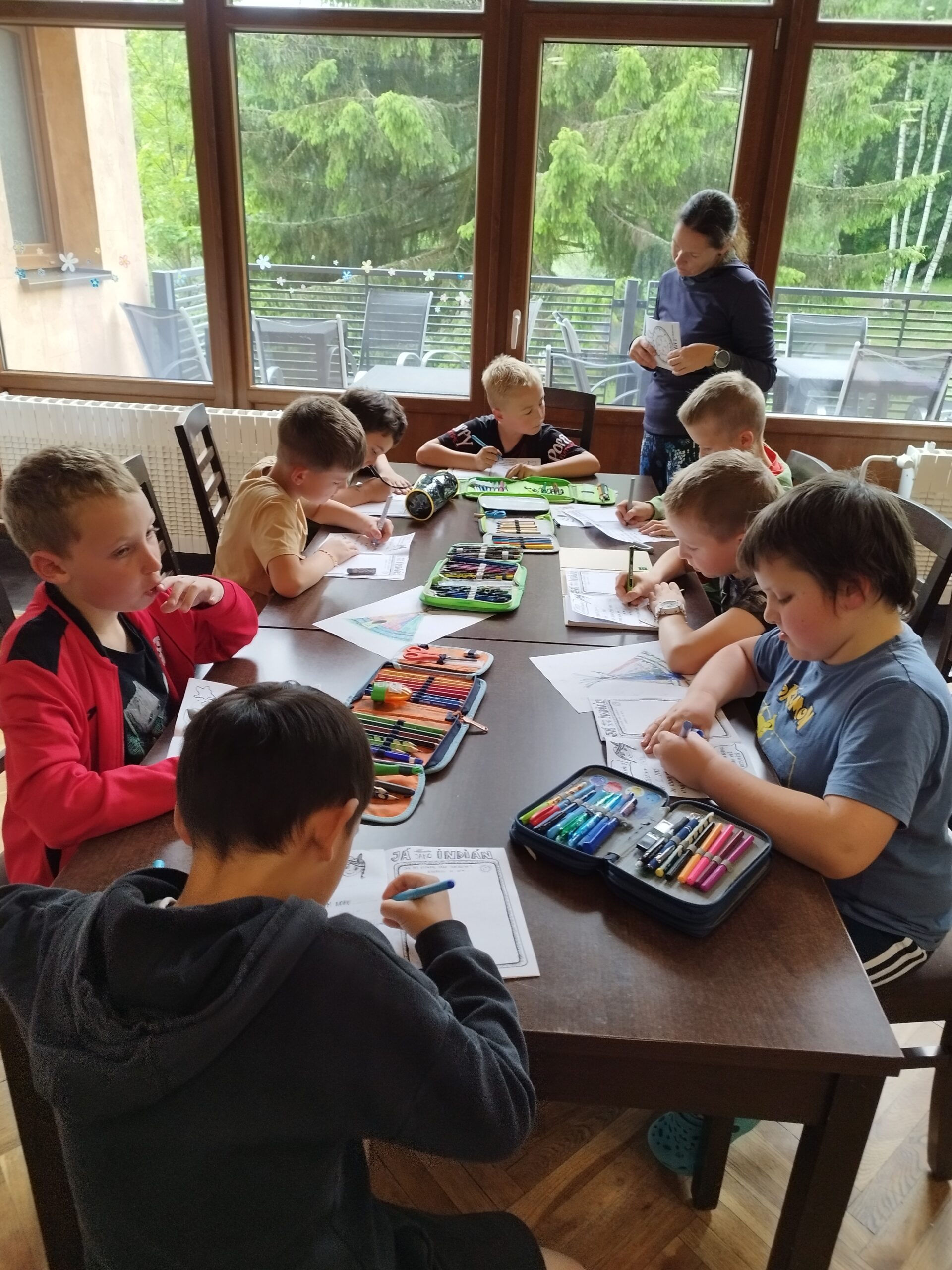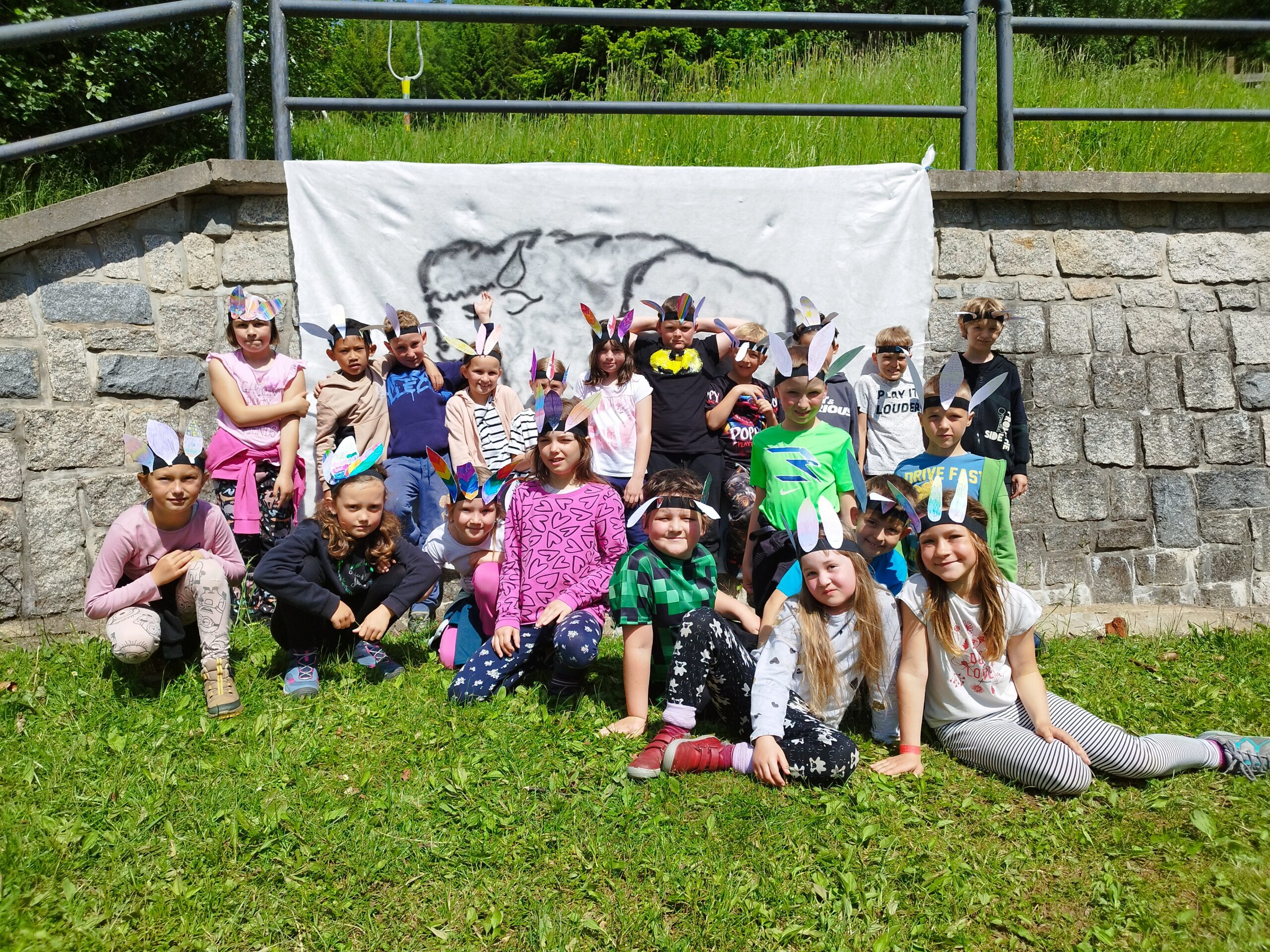 Druhý den nás přivítalo sluníčko a naprosto úžasná snídaně v podobě švédského stolu. Byla šunka, sýr, tři druhy pomazánek, vajíčka natvrdo, mini párečky, zelenina ovoce, med, marmeláda, jogurt, lupínky, mazanec, bábovka… Pak jednotlivé třídy vyrazily dle svého programu do přírody. K obědu jsme se opět sešli u výborného oběda a zase hurá ven. Společnou večeři jsme si osladili s buchtičkami se šódo. Večer druháci vyráběli indiánské čelenky, prvňáci psali deník a páťáci hráli únikovou hru. Zítra druháky a páťáky čeká celodenní výlet, tak šup do postele a dobrou noc.