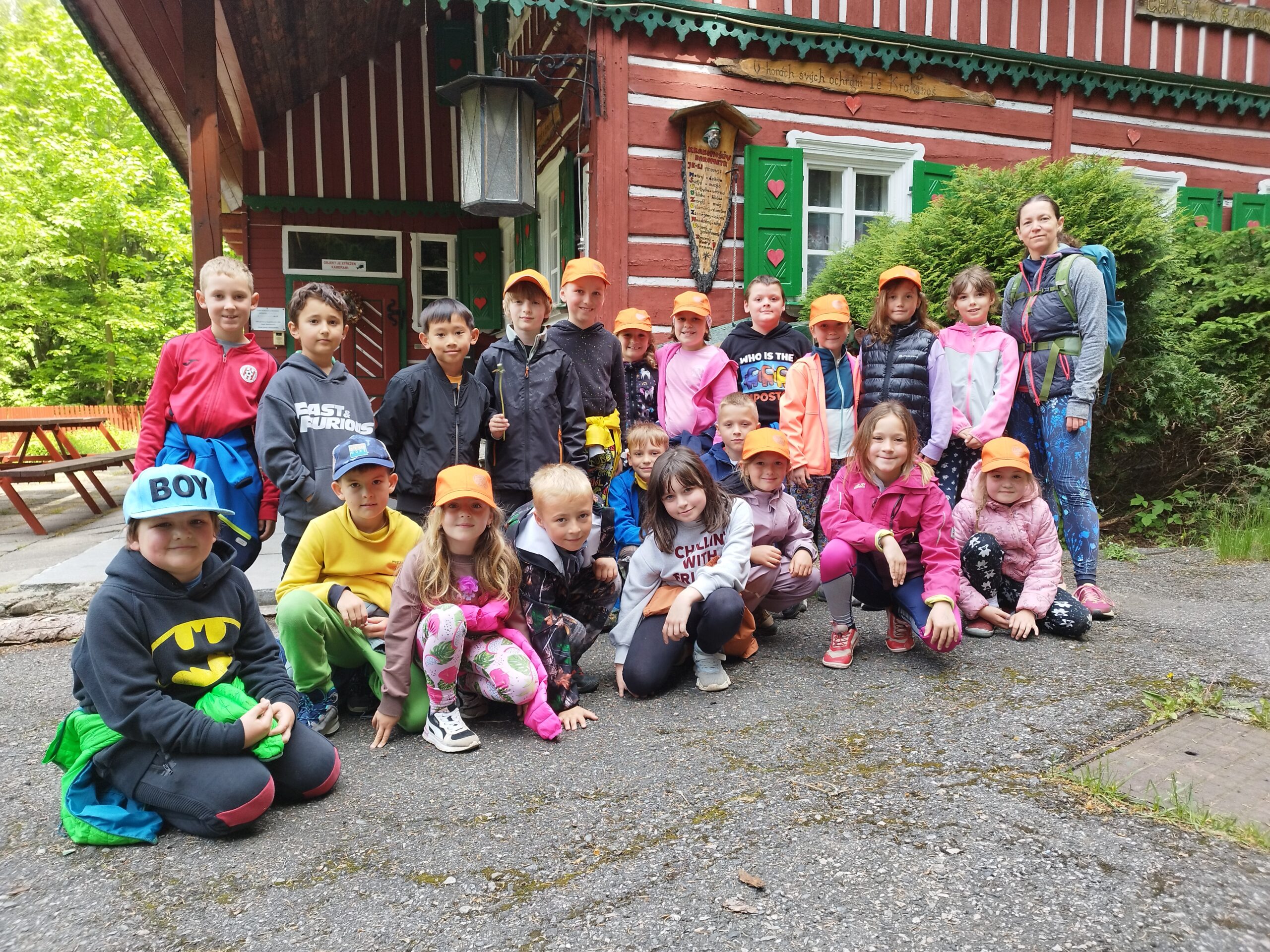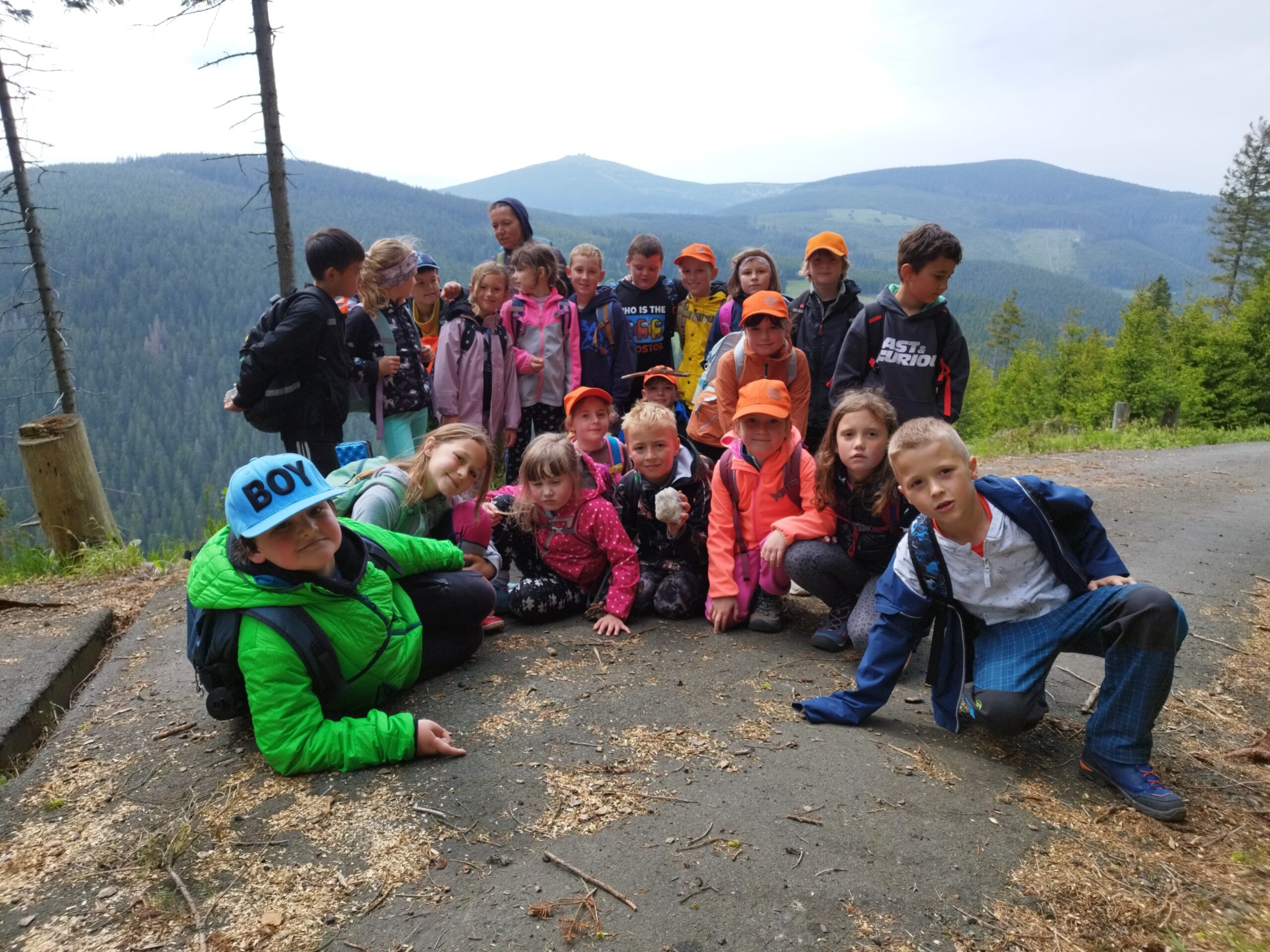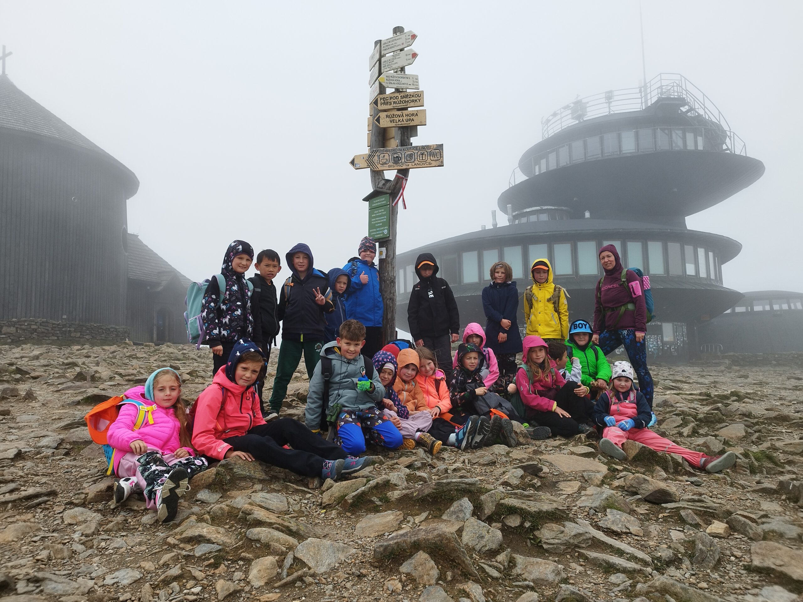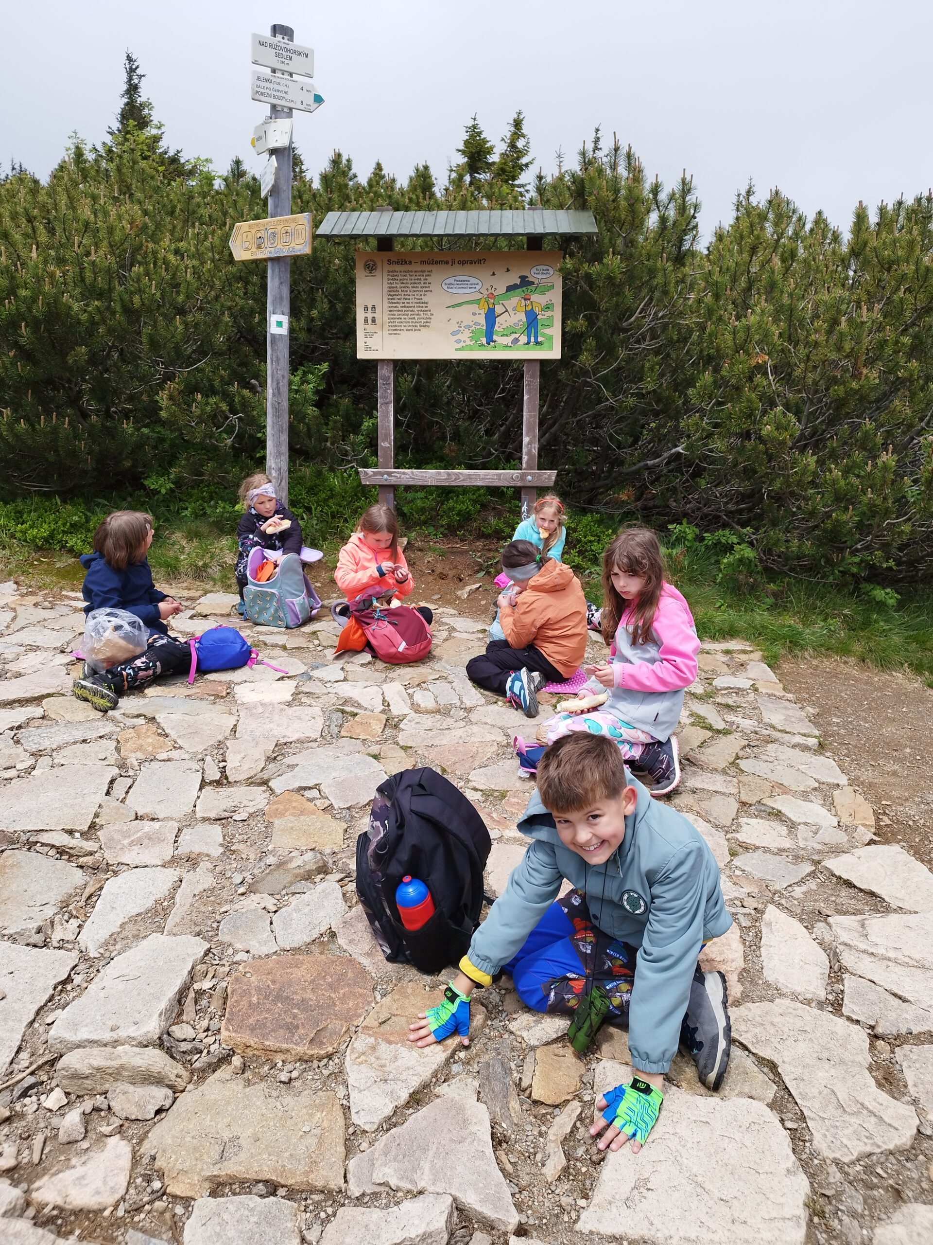 Středa byla ve znamení celodenních výletů. Druhá a pátá třída vyrazila na Sněžku. Počasí bylo všelijaké, ale děti byly skvělé a šlapaly jak o závod. Vrcholu jsme dosáhli všichni, byla to paráda. Prvňáci dopoledne stavěli lesní domečky a odpoledne vyrazily na Pomezní Boudy do korálkové dílny a pak šlapaly pěšky zpět na naši základnu.